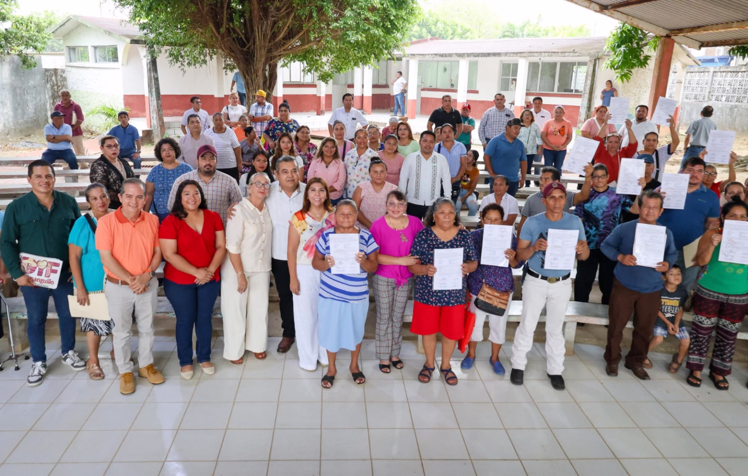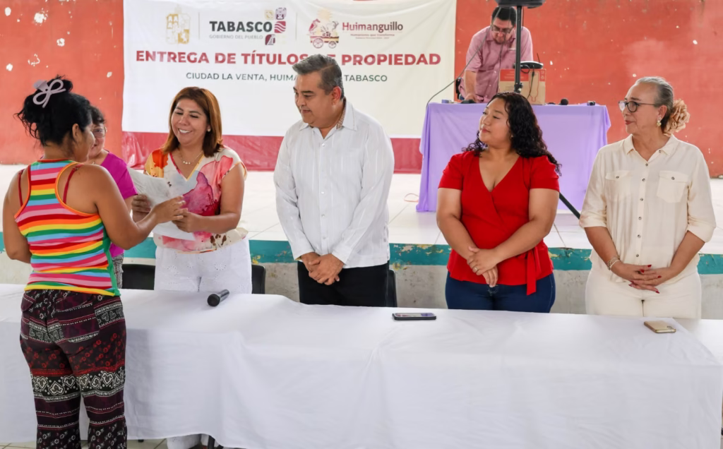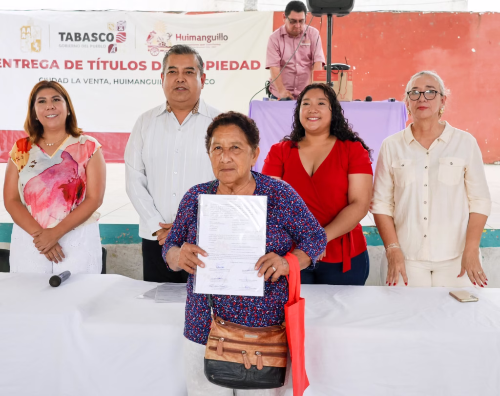 Como parte de las acciones que el Gobierno del Pueblo realiza para combatir el rezago que existe en materia de asentamientos irregulares, se entregaron 22 títulos de propiedad en beneficio de 110 pobladores de La Venta, Huimanguillo.