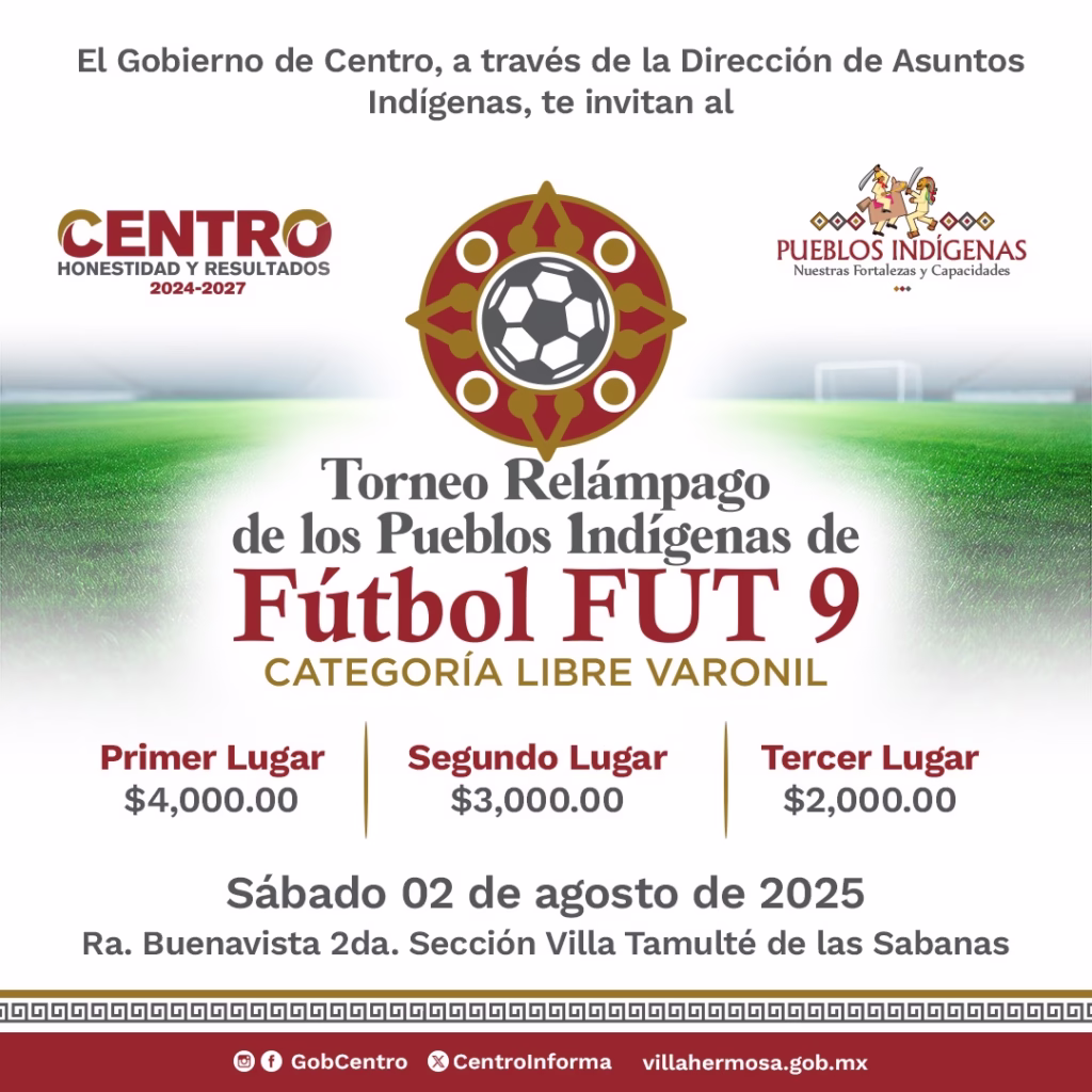Este próximo 2 de agosto de 2025, la pasión por el fútbol y el orgullo de nuestras raíces se vivirán intensamente en el municipio de Centro con la realización del Torneo Relámpago de Pueblos Indígenas, una competencia deportiva que busca fortalecer la identidad cultural y fomentar el deporte en las comunidades originarias del estado.