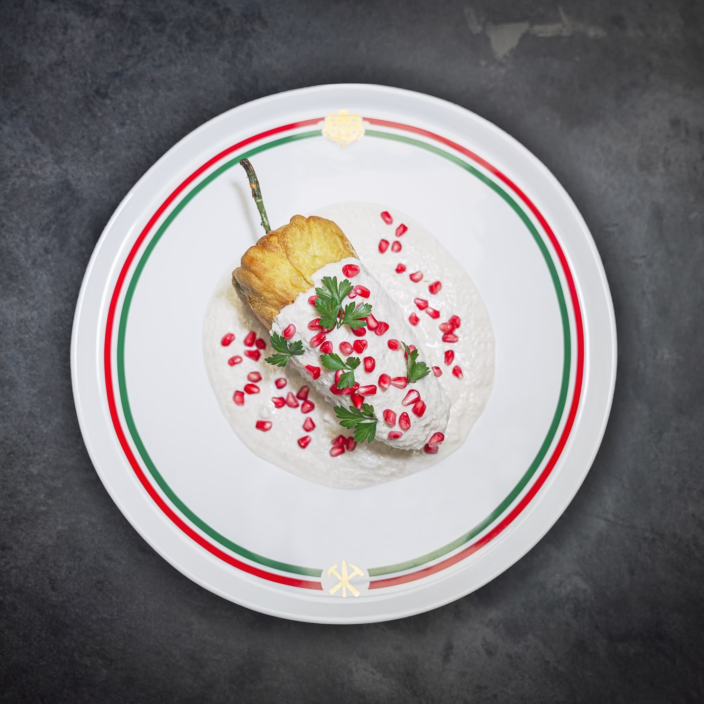 Su versión se elabora con chile poblano de agua capeado, relleno de una mezcla exquisita de manzana panochera, pera lechera, durazno criollo, plátano macho frito y carne de cerdo, lo que aporta un equilibrio perfecto entre lo dulce y lo salado. La magia se completa con una nogada martajada preparada con nuez de Castilla fresca, queso de cabra y un delicado toque de jerez, coronada con granada roja y perejil fresco.