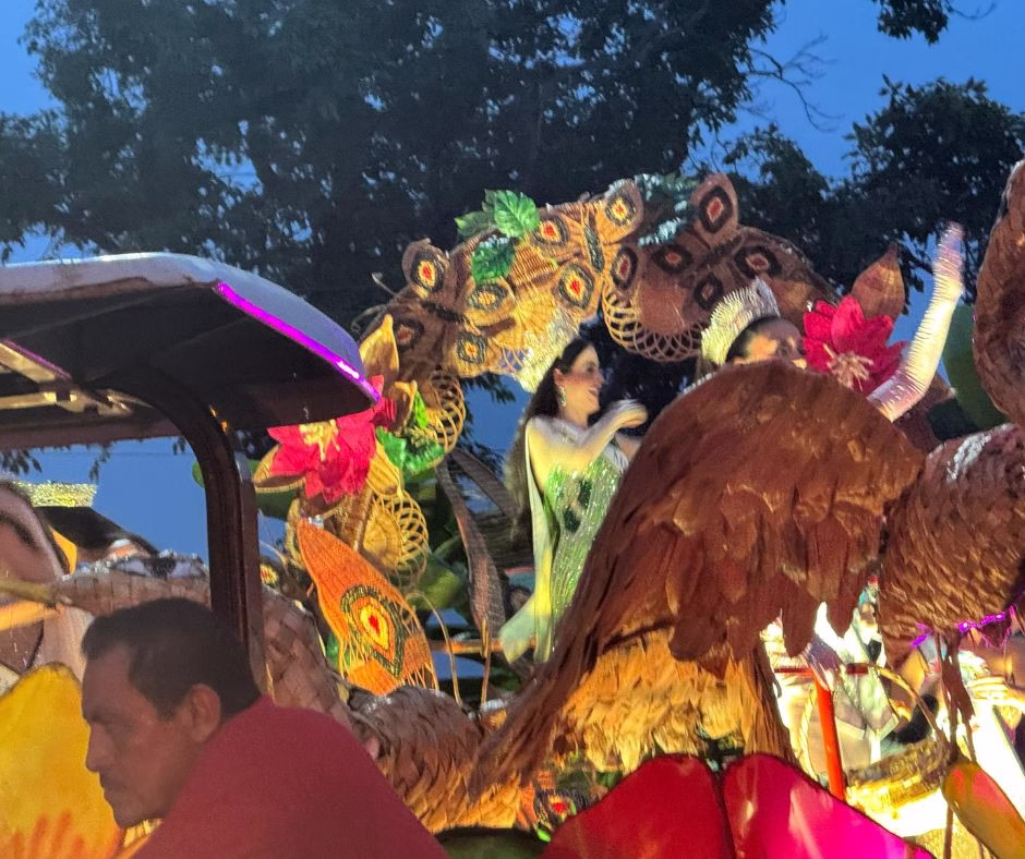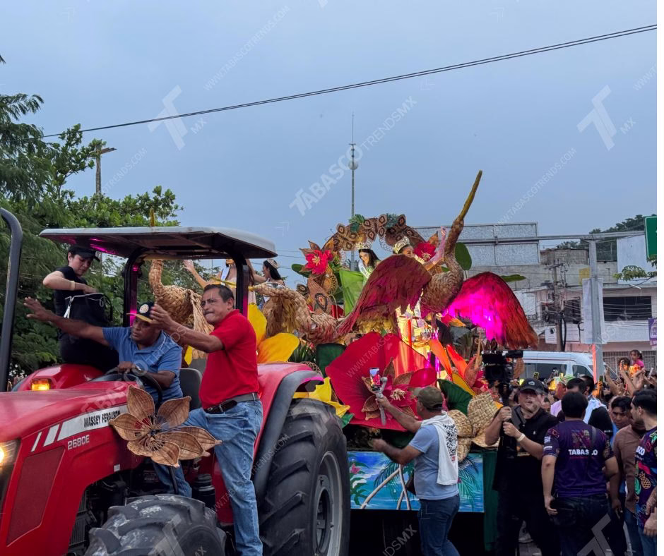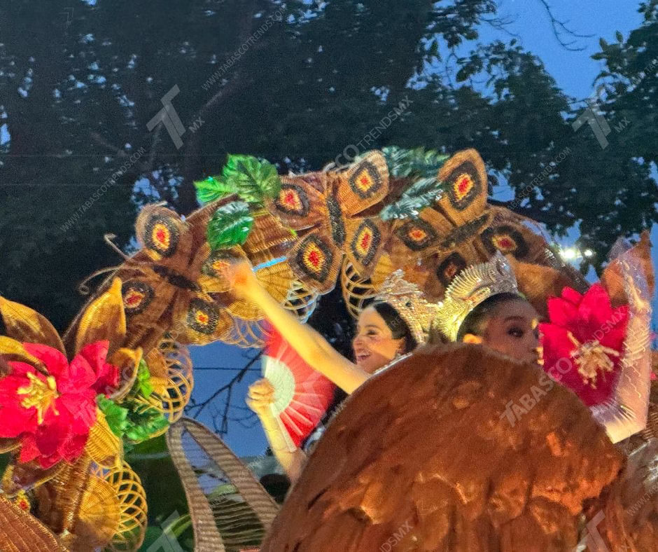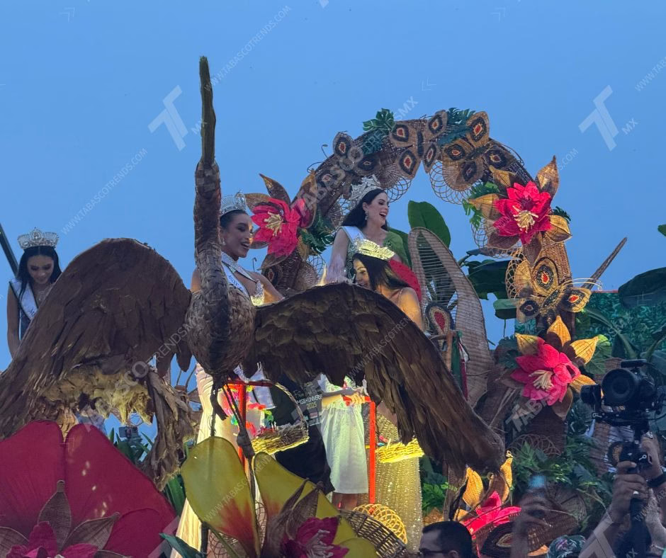 El carro alegórico diseñado con garzas de petate, guano, mariposas de colores y granos de semillas, llevaba la leyenda “Miss Universe México 2025, Fátima Bosch” a sus costados. La joven, también Flor Tabasco 2018, subió a la carroza a las 5:51 de la tarde, robándose los aplausos y los corazones de todos los presentes antes de iniciar su recorrido oficial. Junto a ella estuvieron las representantes de Tlaxcala, Tamaulipas, Yucatán y Veracruz, quienes acompañaron en un desfile lleno de brillo y alegría.