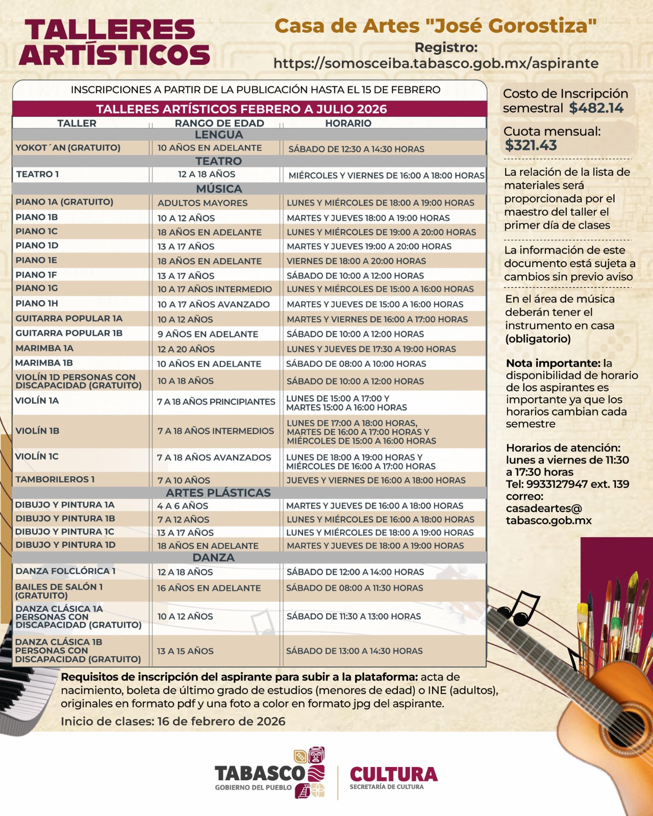La Secretaría de Cultura de Tabasco ha oficializado la apertura de inscripciones para los Talleres Artísticos de nuevo ingreso 2026 en la emblemática Casa de Artes “José Gorostiza”. El proceso que permanecerá abierto hasta el 15 de febrero, representa una oportunidad clave para el desarrollo cultural en Villahermosa, ofreciendo formación técnica y profesional en diversas disciplinas artísticas con un enfoque inclusivo y digital.
