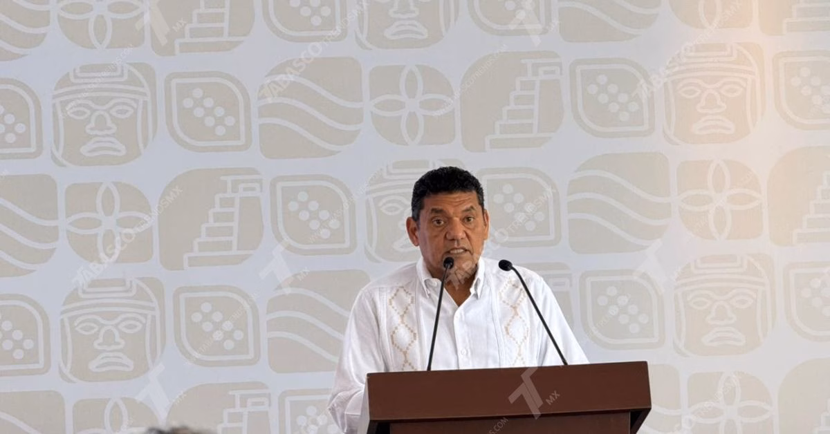 El Gobernador De Tabasco, Javier May Rodríguez, De Pie Tras Un Podio Con Micrófonos, Vistiendo Una Guayabera Blanca Tradicional.