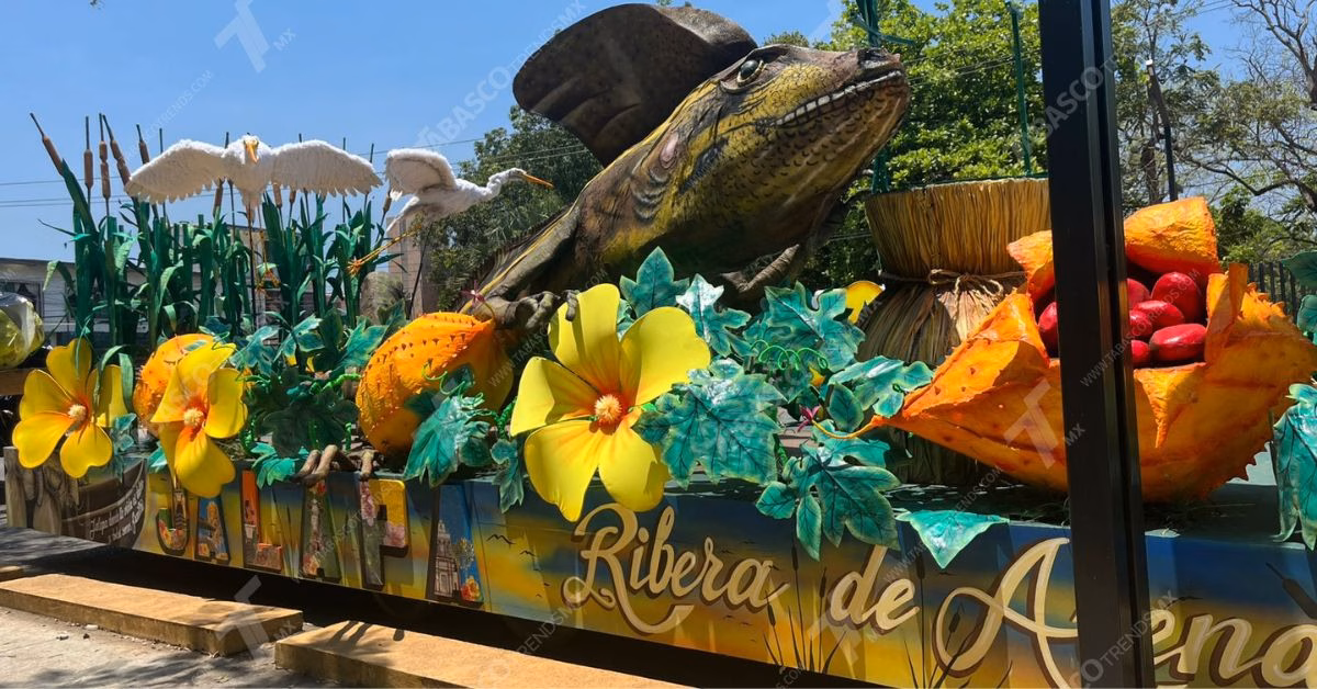 Un vistazo al vibrante carro alegórico de Jalapa en preparación para el desfile. Las esculturas de gran tamaño de flores amarillas y frutos texturizados, junto con los murales que celebran la identidad del municipio como la "Rivera de Arena" y la "tierra donde la vida es dulce", prometen un espectáculo lleno de color y orgullo local.