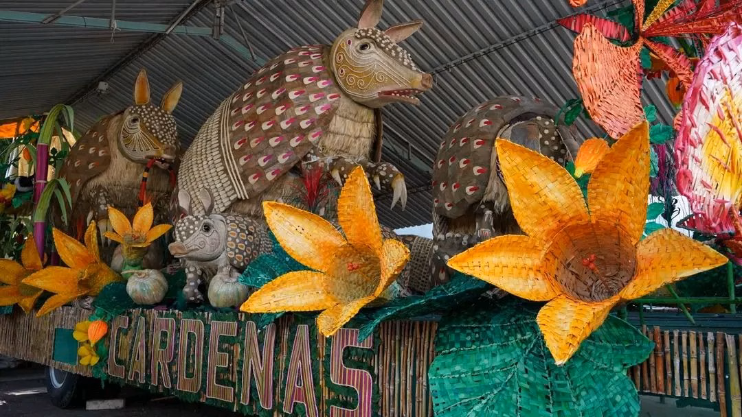 sí se ve "Ternuras del Cañaveral", el majestuoso carro alegórico de Cárdenas, creado por el maestro Jorge Enrique Oyosa Ortiz. Esta pieza artesanal, que destaca por el uso de materiales 100% regionales como hojas de macuilí y fibra de coco, no solo es una explosión de color, sino un poderoso llamado a la protección del armadillo en peligro de extinción. Una propuesta que, junto a la embajadora Valeria Gallegos Rosique, busca conquistar la Flor de Oro 2026.